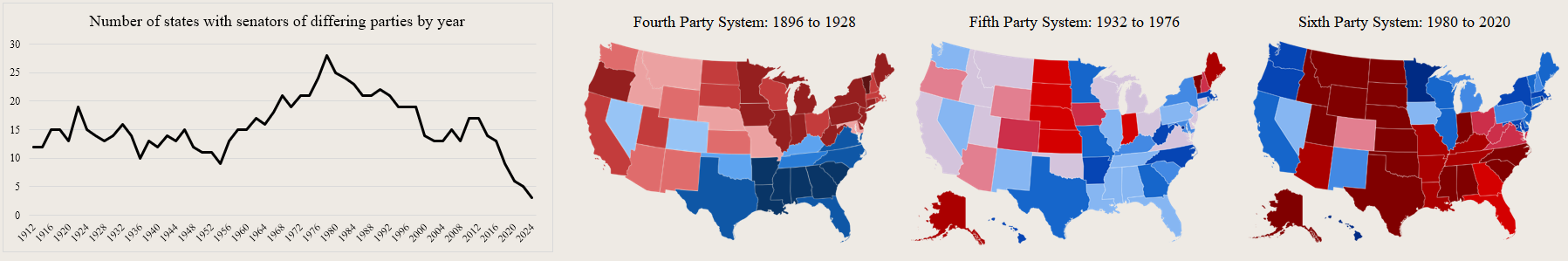 The current understanding of state party-allegiance is of twenty-four Republican states, seven swing-states, and nineteen Democratic states. The Democratic states have 37 Democratic senators and 1 Republican; since the 2024 elections, the Republican states are a 48 senator clean sweep; and the Democrats have a strong lead in the swing states with 10 blue to 4 red. Despite this clear advantage, they are of course in the minority, with only 47 in total. If the Democrats do manage a federal trifecta (and kill the filibuster), statehood for DC, which has no voting representation in congress, should be top priority, especially given the district’s strong desire for it. Referenda in Puerto Rico are far less clear cut on support for statehood, and with Trump out of the picture, PR would probably redden from blue to purple, but it seems likely that PR will become a state at some point, and they should certainly be given the choice. But even then, Democrats would face difficulty in taking the senate and instead need to find wins in red states.
